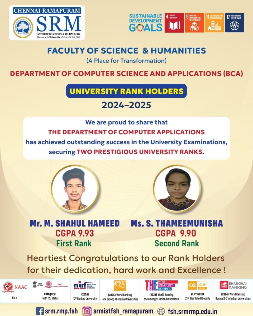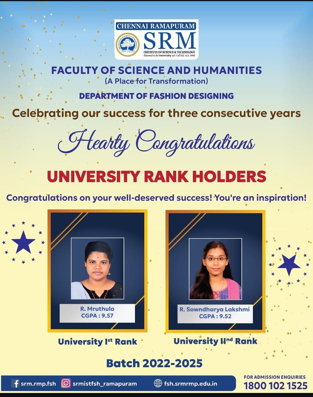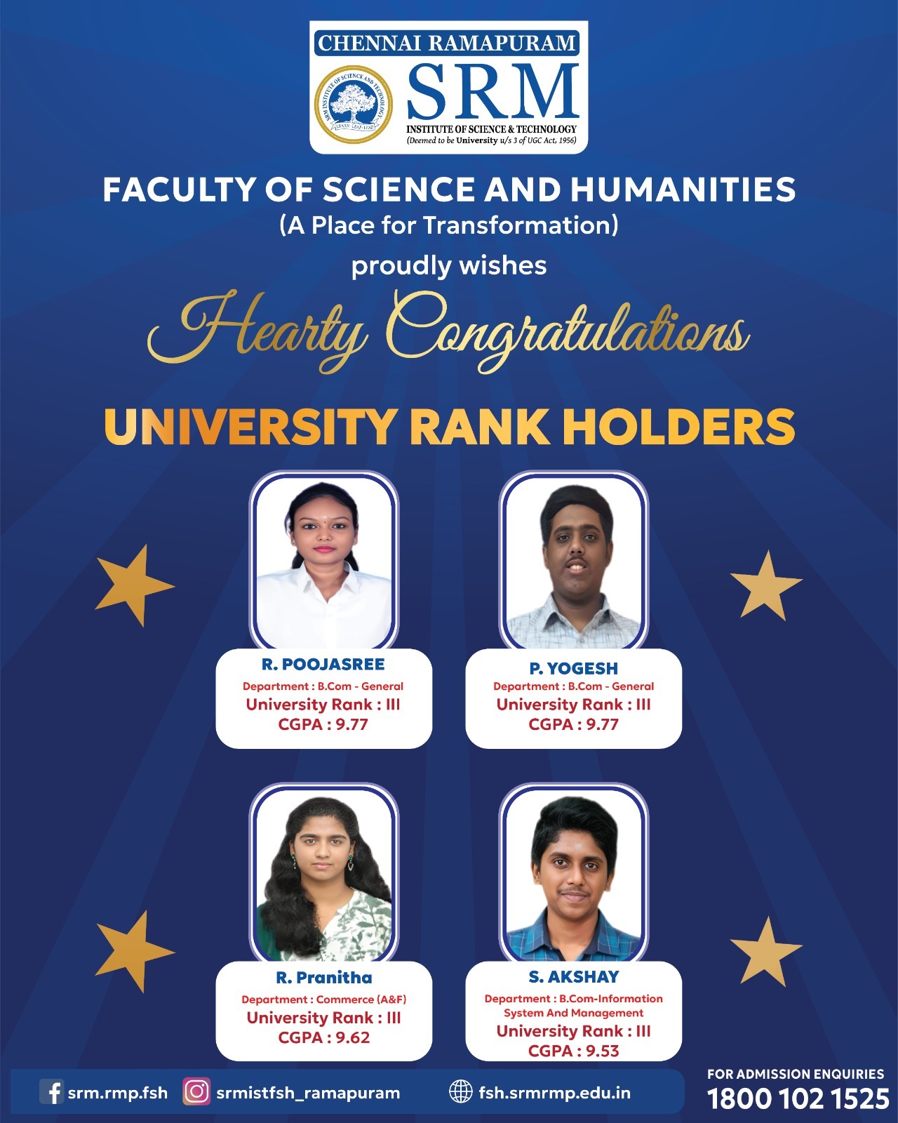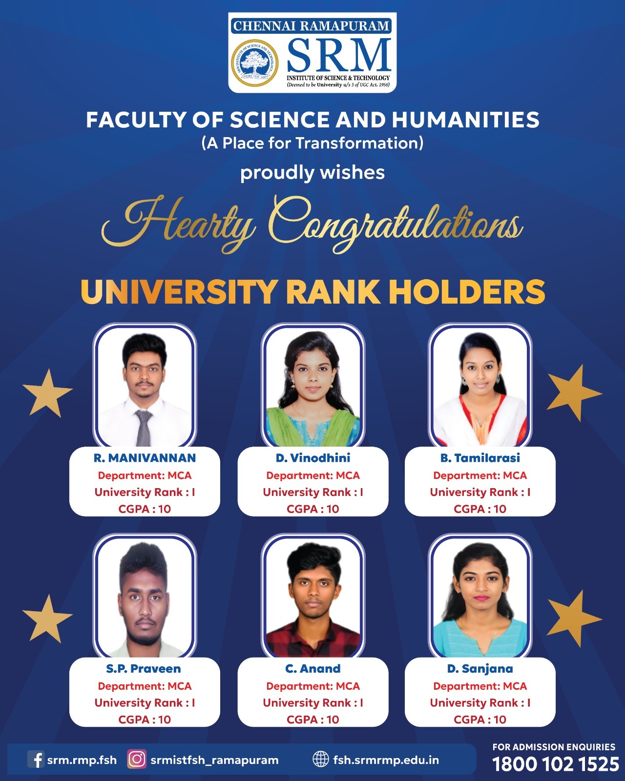 The Faculty of Science and Humanities, SRM Institute of Science and Technology, Ramapuram Campus is proud to announce that our students have secured an impressive 34 University Ranks in the Examinations held in May 2025.These ranks span across all disciplines of FSH, showcasing the academic excellence, hard work, and commitment of our students, along with the dedicated mentorship of our faculty members.This achievement stands as a testimony to the vibrant academic culture and holistic learning environment at FSH, SRM Ramapuram.Congratulations to all our rank holders for bringing glory to the institution!