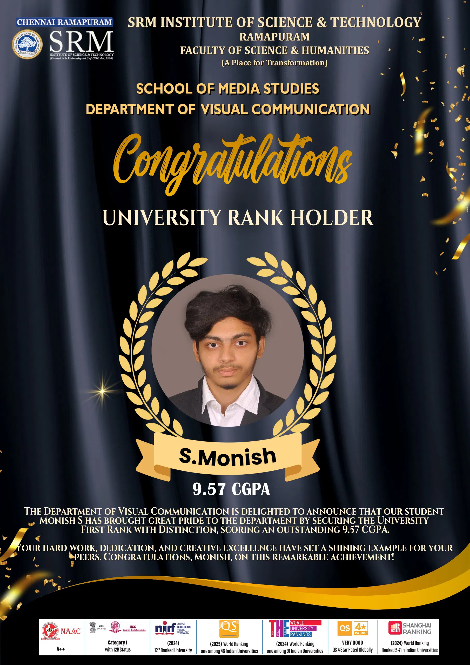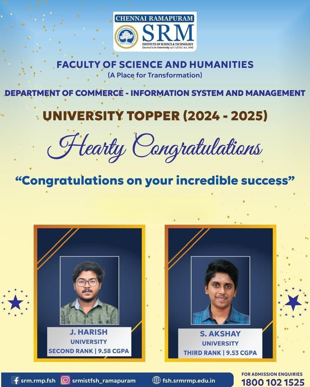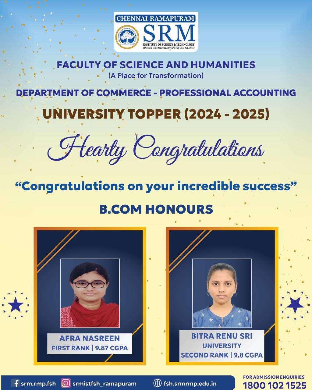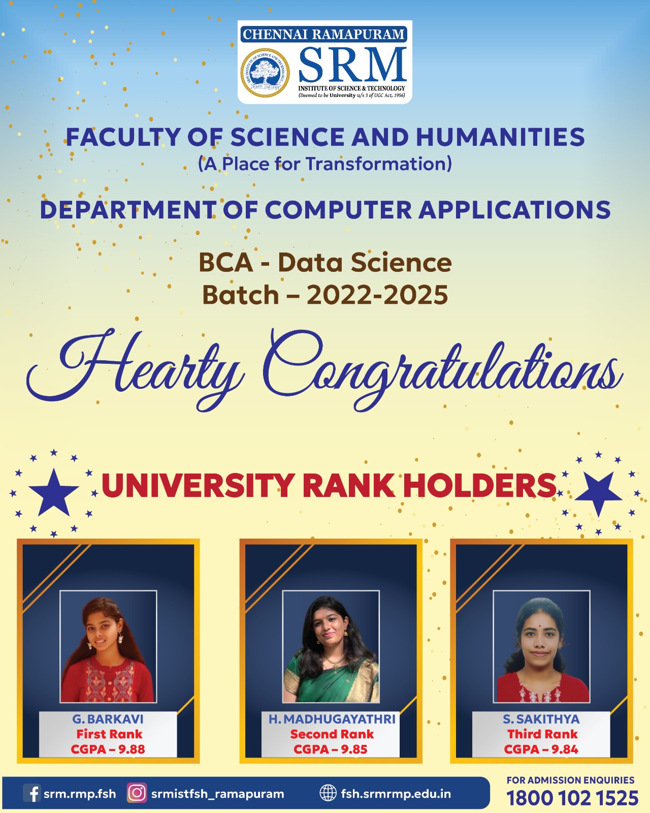 The Faculty of Science and Humanities, SRM Institute of Science and Technology, Ramapuram Campus is proud to announce that our students have secured an impressive 34 University Ranks in the Examinations held in May 2025.These ranks span across all disciplines of FSH, showcasing the academic excellence, hard work, and commitment of our students, along with the dedicated mentorship of our faculty members.This achievement stands as a testimony to the vibrant academic culture and holistic learning environment at FSH, SRM Ramapuram.Congratulations to all our rank holders for bringing glory to the institution!