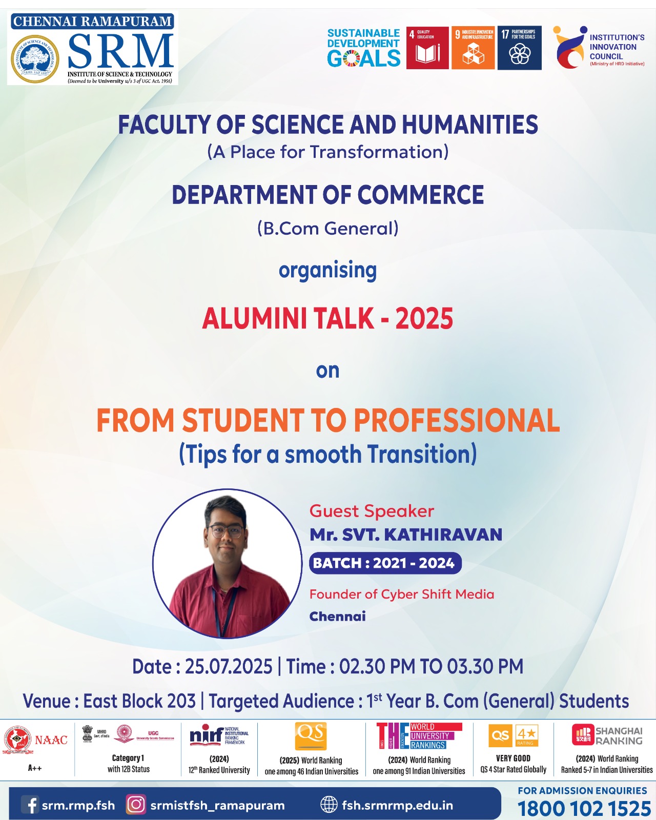 RESOURCE PERSON Mr. SVT. KATHIRAVAN Founder of Cyber Shift Media BATCH: 2021 – 2024 Date: 25.07.2025 Time: 02:30 pm – 03:30 pm Venue: East Block Room 204 PrevNext