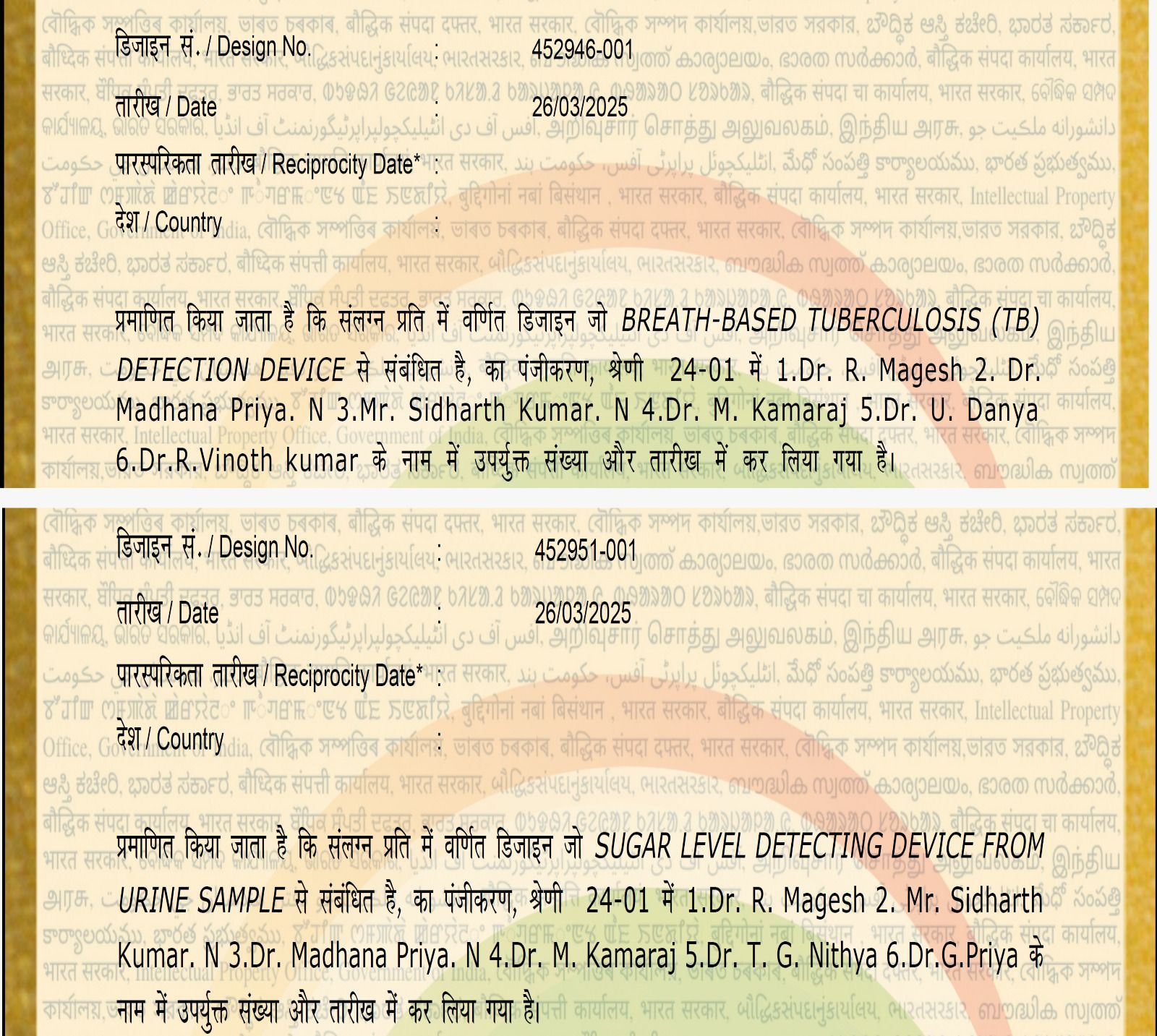 The Department of Biotechnology, FSH, SRMIST – Ramapuram proudly congratulates our faculty members Dr. M. Kamaraj, Dr. G. Priya, and Dr. R. Vinoth Kumar for being granted Indian Design Patents for their innovative contributions in the field of biomedical devices.